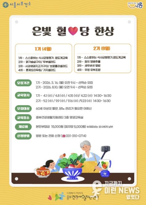 이런뉴스(e-runnews) 김삼성 기자 | 시흥시보건소 중부건강생활지원센터는 고혈압과 당뇨 관리가 필요한 어르신의 건강한 식생활 실천을 돕기 위해 영양교육 프로그램 ‘은빛 혈당 한상’을 4월 1일부터 센터 영양교육실에서 운영한다.