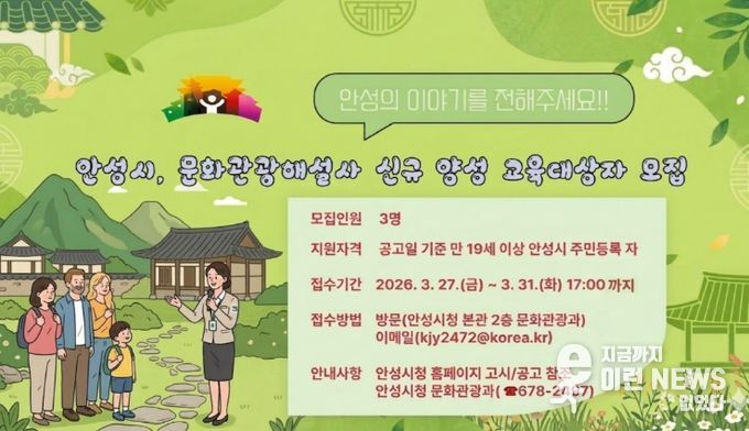 이런뉴스(e-runnews) 김삼성 기자 | 안성시가 지역의 문화・역사・관광 자원을 관광객의 눈높이에 맞춰 전달할 문화관광해설사 신규 양성교육 대상자를 모집한다.