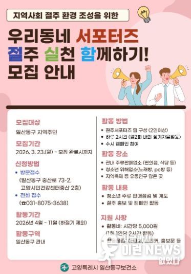 이런뉴스(e-runnews) 김삼성 기자 | 고양특례시 일산동구보건소는 건전한 음주문화 확산과 절주 실천 분위기 조성을 위한 ‘우리동네 서포터즈’의 참가자를 오는 3월 23일부터 모집한다.