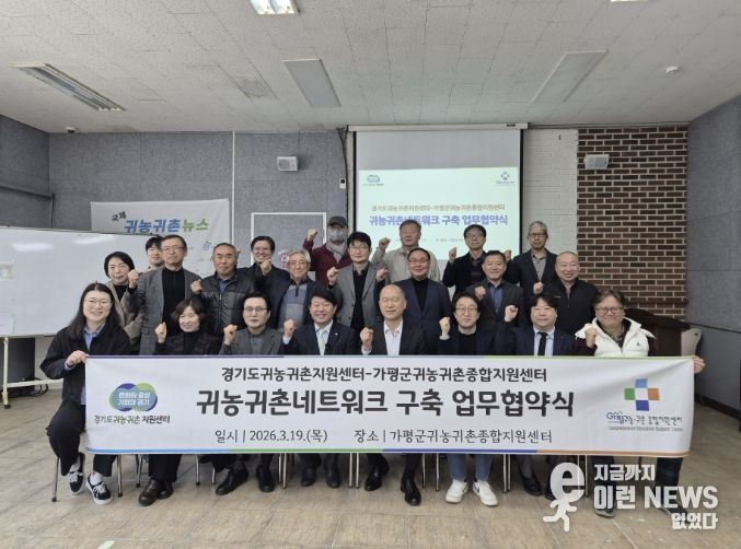 이런뉴스(e-runnews) 김삼성 기자 | 가평군귀농귀촌종합지원센터와 경기도귀농귀촌지원센터는 19일 가평 교육장에서 귀농귀촌 네트워크 구축을 위한 업무협약(MOU)을 체결했다. 이번 협약은 귀농귀촌 희망자의 안정적인 농촌 정착을 지원하고 경기도 농어촌의 지속 가능한 발전을 도모하기 위해 마련됐다.