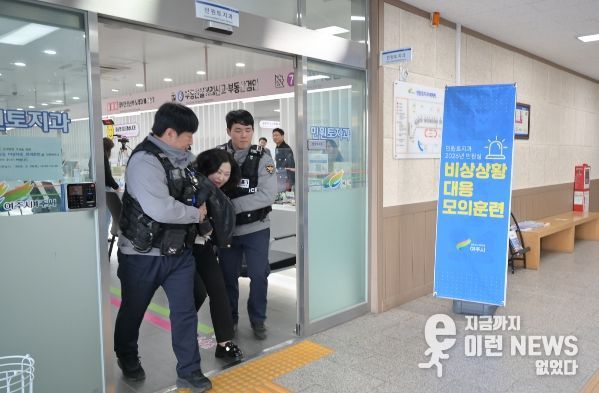 이런뉴스(e-runnews) 김삼성 기자 | 여주시는 19일 민원토지과에서 여주경찰서와 함께 ‘민원실 비상 상황 대응 모의훈련’을 실시했다.