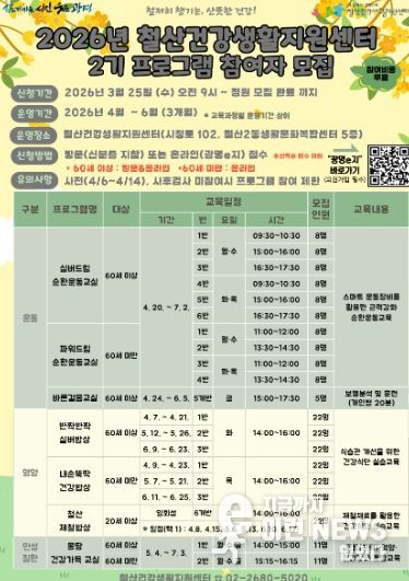 이런뉴스(e-runnews) 김삼성 기자 | 광명시 보건소 철산건강생활지원센터가 ‘2026년 건강생활 프로그램 2기’ 참가자를 오는 25일 오전 9시부터 선착순 모집한다.