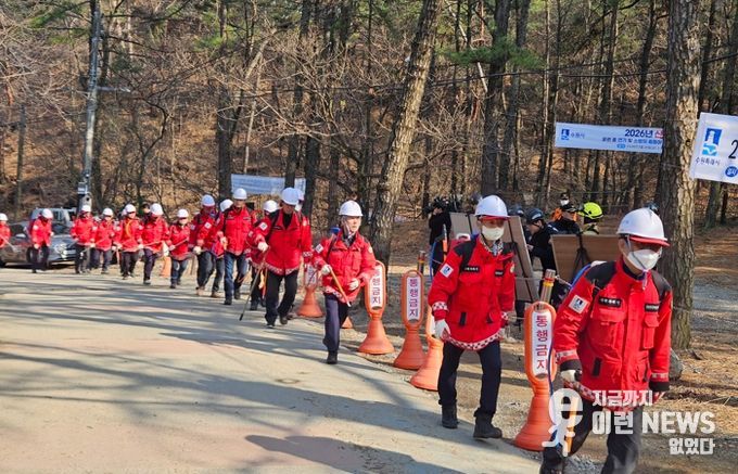 이런뉴스(e-runnews) 김삼성 기자 | 수원특례시는 20일 칠보산 용화사 인근과 자목마을 일원에서 ‘2026년 산림 재난(산불) 대응 훈련’을 하고, 산불 대응체계를 점검했다.