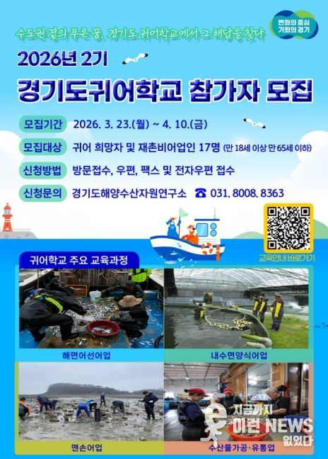 이런뉴스(e-runnews) 김삼성 기자 | 경기도해양수산자원연구소는 귀어 희망자의 어촌 정착을 지원하기 위해 4월 10일까지 ‘2026년 2기 귀어학교’ 교육 프로그램 참가자를 모집한다.