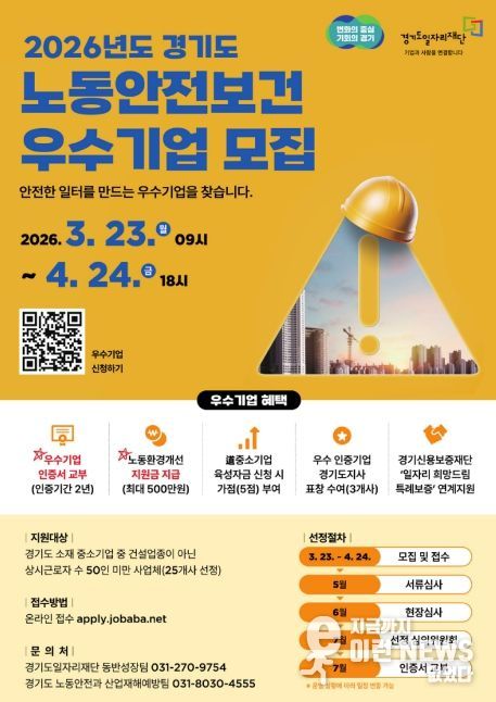 이런뉴스(e-runnews) 김삼성 기자 | 경기도와 경기도일자리재단은 산업재해 예방과 안전한 일자리 환경 조성을 위해 ‘2026년 경기도 노동안전보건 우수기업 인증사업’ 참여기업을 오는 4월 24일까지 모집한다.