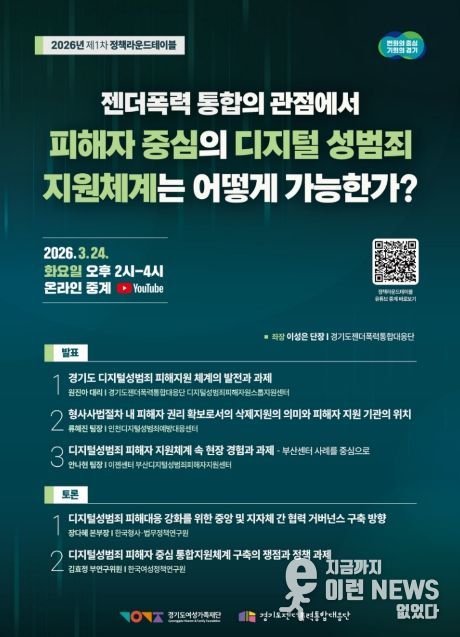이런뉴스(e-runnews) 김삼성 기자 | 경기도와 경기도젠더폭력통합대응단은 24일 오후 2시 ‘젠더폭력 통합의 관점에서 피해자 중심의 디지털 성범죄 지원체계는 어떻게 가능한가?’라는 주제로 2026년 제1차 정책라운드테이블을 개최한다.