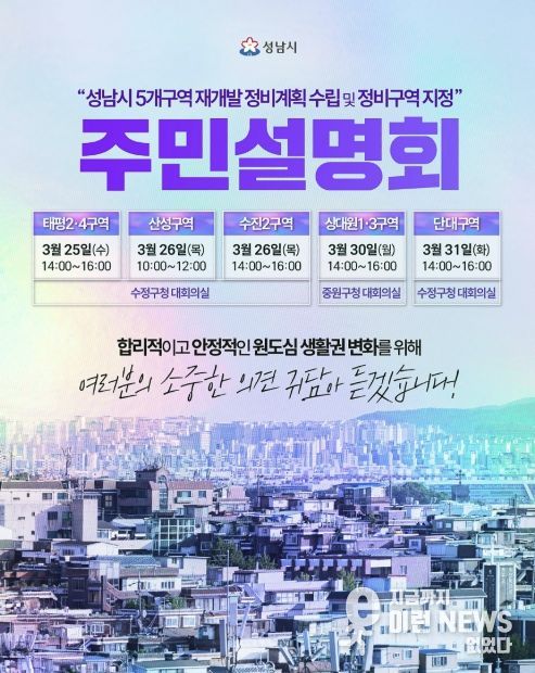 설명회 일정은 △3월 25일 오후 2시 태평2‧4구역(수정구청 대회의실)을 시작으로 △3월 26일 오전 10시 산성구역, 같은 날 오후 2시 수진2구역(수정구청 대회의실) △3월 30일 오후 2시 상대원1‧3구역(중원구청 대회의실) △3월 31일 오후 2시 단대구역(수정구청 대회의실) 순으로 진행된다.