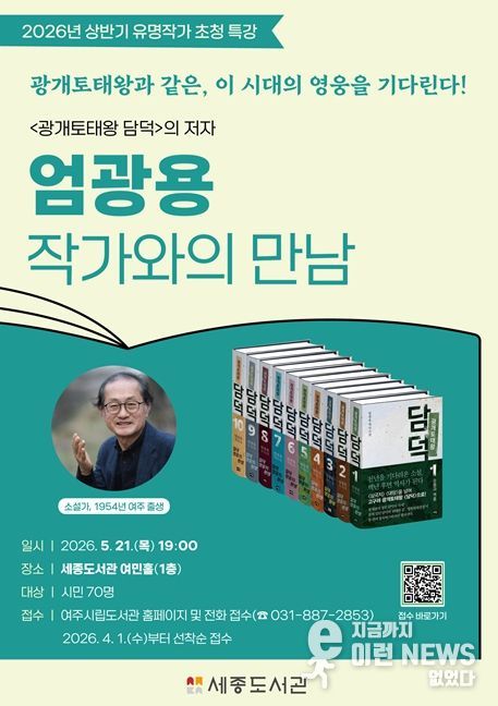 이런뉴스(e-runnews) 김삼성 기자 | 여주시는 오는 5월 21일 오후 7시 세종도서관에서 대하소설 '광개토태왕 담덕'의 저자, 엄광용 작가를 초청하여 작품과 작가의 세계관에 대해 시민들과 이야기하는 ‘엄광용 작가와의 만남’을 운영한다.