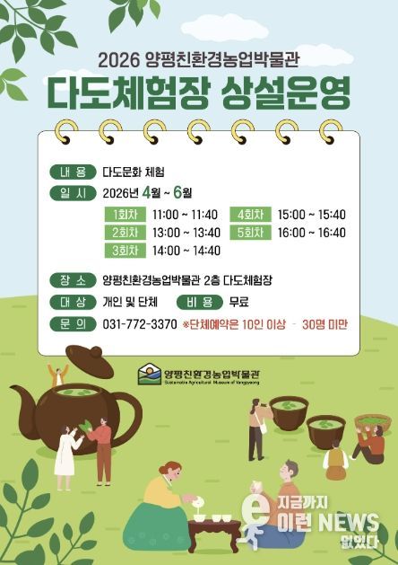 이런뉴스(e-runnews) 김삼성 기자 | 양평친환경농업박물관은 오는 4월부터 6월까지 박물관 2층 다도체험장에서 상반기 다도체험 프로그램을 운영한다고 밝혔다.
