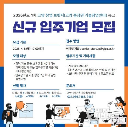 이런뉴스(e-runnews) 김삼성 기자 | 고양산업진흥원이 운영하는‘고양 창업 브릿지(고양중장년기술창업센터)’가 오는 4월 6일까지 신규 입주할 예비창업자와 창업기업을 모집한다.