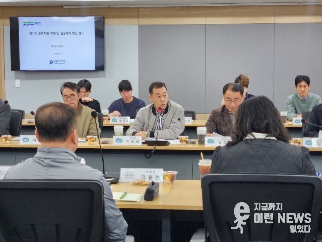 이런뉴스(e-runnews) 김삼성 기자 | 경기도의회 경제노동위원회 이용호 부위원장(국민의힘, 비례)은 23일 경기도청 서희홀에서 열린 ‘경기도 공무직원 직무 및 임금체계 개선 연구용역’ 중간보고회에 참석해 공직 노동자들의 불합리한 처우 개선과 제도적 협의 기구 마련을 강력히 촉구했다.