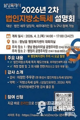 이런뉴스(e-runnews) 김삼성 기자 | 화성특례시 만세구청이 지난 1차 설명회의 뜨거운 관심에 힘입어, 오는 4월 2일 오후 2시 향남읍 행정복지센터에서 ‘2차 법인지방소득세 설명회’를 개최한다.