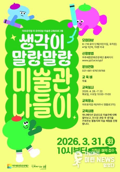 이런뉴스(e-runnews) 김삼성 기자 | 여주세종문화관광재단은 유아를 대상으로 하는 미술관 교육프로그램 '생각이 말랑말랑, 미술관 나들이'를 오는 4월부터 10월까지 아트뮤지엄 려에서 운영한다고 밝혔다.