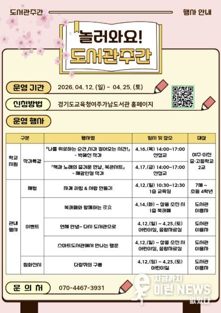 이런뉴스(e-runnews) 김삼성 기자 | 경기도여주교육지원청 직속기관인 경기도교육청여주가남도서관은 4월 도서관주간을 맞아 지역주민과 학생들을 위한 다양한 독서문화 프로그램을 운영한다.