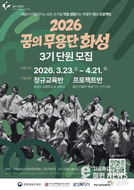 이런뉴스(e-runnews) 김삼성 기자 | (재)화성시문화관광재단은 지역 내 아동·청소년의 문화예술 향유를 위한 예술교육 프로그램 ‘2026 꿈의 무용단 화성’의 단원을 오는 3월 23일부터 4월 21일까지 모집한다고 밝혔다.