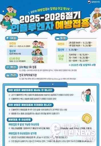 2025-2026절기 독감 무료 접종 대상은 ▲어린이(생후 6개월~13세 이하) ▲임신부 ▲65세 이상 어르신(1960.12.31. 이전 출생자)이다. 별도의 예약 없이 신분증을 지참하여 지정 위탁의료기관에서 접종할 수 있으며, 해당 기관정보는 예방접종도우미 누리집에서 확인할 수 있다.