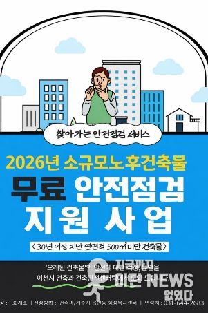 이런뉴스(e-runnews) 김삼성 기자 | 이천시는 건축물 노후화로 인한 안전사고를 예방하고 시민 안전을 강화하기 위해 ‘2026년 찾아가는 소규모 노후건축물 안전점검 지원사업’을 추진한다고 밝혔다.