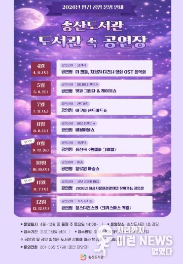 이런뉴스(e-runnews) 김삼성 기자 | 화성시문화관광재단 송산도서관은 오는 4월부터 12월까지 지역 주민들에게 풍요로운 문화 체험의 기회를 제공하는 연간 상설 공연 프로그램 '도서관 속 공연장'을 운영한다.