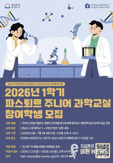 이런뉴스(e-runnews) 김삼성 기자 | 성남시는 2026년 상반기 한국파스퇴르연구소 ‘파스퇴르 주니어 과학교실’ 참여 학생을 모집한다.