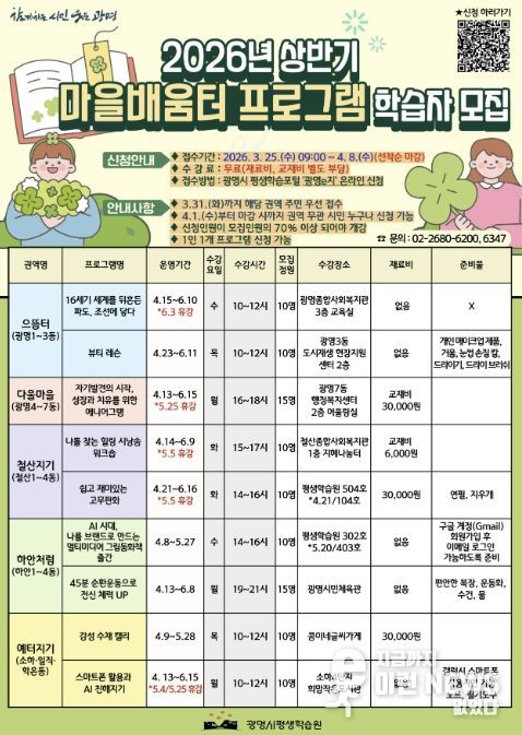 이런뉴스(e-runnews) 김삼성 기자 | 광명시가 시민들이 생활권 내에서 평생학습을 누릴 수 있도록 ‘2026년 상반기 권역별 마을배움터 프로그램’ 수강생을 오는 4월 8일까지 모집한다.
