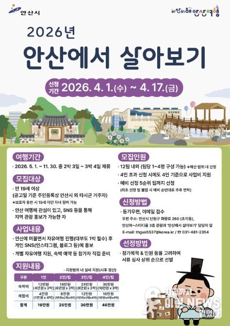 이민근 안산시장은 “이번 프로그램을 통해 더 많은 사람들이 안산을 찾고 지역의 다양한 매력이 널리 알려지길 바란다”며 “아울러 참여자들의 SNS 홍보가 지역경제 활성화에도 긍정적인 역할을 할 것으로 기대한다”고 말했다.