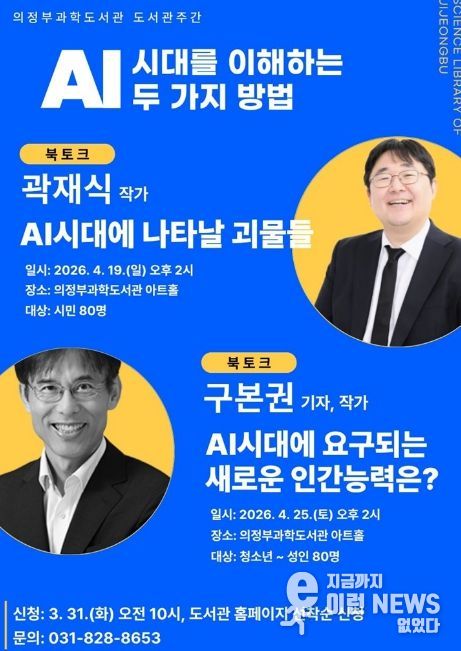 이런뉴스(e-runnews) 김삼성 기자 | 의정부과학도서관은 ‘제62회 도서관주간’과 ‘제4회 도서관의 날’을 맞아 4월 19일부터 30일까지 ‘AI 시대를 이해하는 두 가지 방법’을 주제로 시민 대상 작가 북토크를 개최한다.