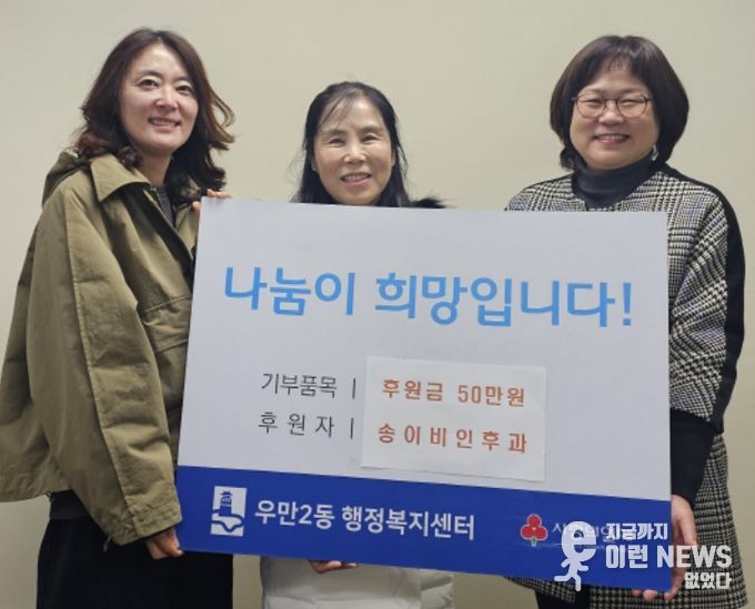 이런뉴스(e-runnews) 김삼성 기자 | 수원시 팔달구 우만2동은 지난 24일, 송이비인후과으로부터 취약계층 지원을 위한 이웃돕기 후원금 50만 원을 기탁받았다고 밝혔다.