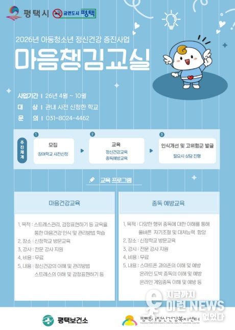 이런뉴스(e-runnews) 김삼성 기자 | 평택시는 스쿨케어 사업의 일환으로 관내 학교 학생들을 대상으로 『마음챙김교실』을 운영한다고 밝혔다. 이번 프로그램은 학생들이 교육을 통해 정신건강을 올바르게 인식하고 스스로 관리할 수 있도록 지원함으로써 마음 건강 증진을 도모하는 데 목적이 있다.