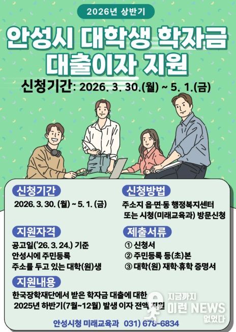 이런뉴스(e-runnews) 김삼성 기자 | 안성시는 대학생 및 대학원생들의 교육비 부담을 덜어주기 위해 ‘2026년 상반기 대학생 학자금 대출이자 지원사업’을 시행한다고 밝혔다.