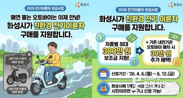 이런뉴스(e-runnews) 김삼성 기자 | 화성특례시가 온실가스 감축과 대기환경 개선을 위해 2026년도 상반기 전기 이륜차 보급 사업 신청자 모집을 한다고 25일 밝혔다.