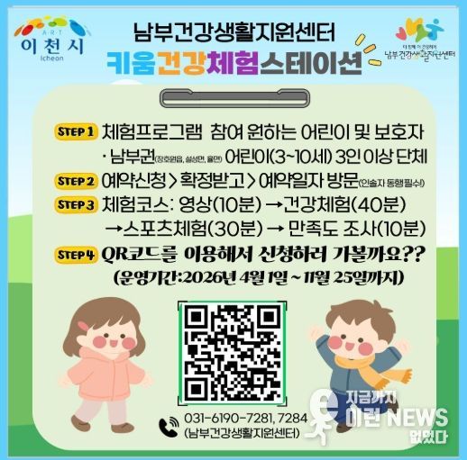 이런뉴스(e-runnews) 김삼성 기자 | 이천시 남부건강생활지원센터는 어린이의 올바른 생활 습관 형성을 위해 체험형 프로그램인 ‘남부 키움건강체험스테이션’을 오는 4월부터 운영한다고 밝혔다.