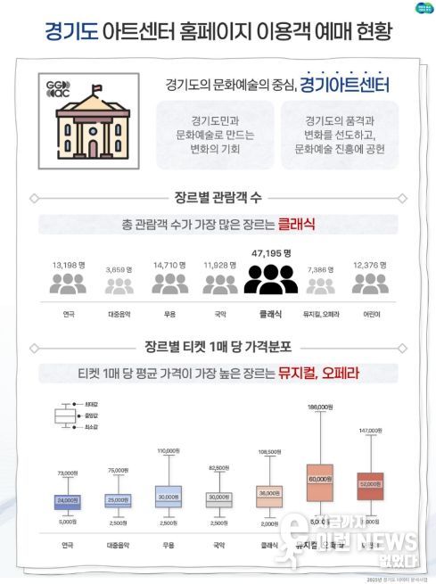 경기아트센터 공연 예매 데이터 분석에서는 클래식 장르 관람객이 약 4만 7천 명으로 가장 높은 선호도를 보였다. 도는 이러한 데이터를 향후 수요자 맞춤형 공연 기획의 기초 자료로 활용할 계획이다.