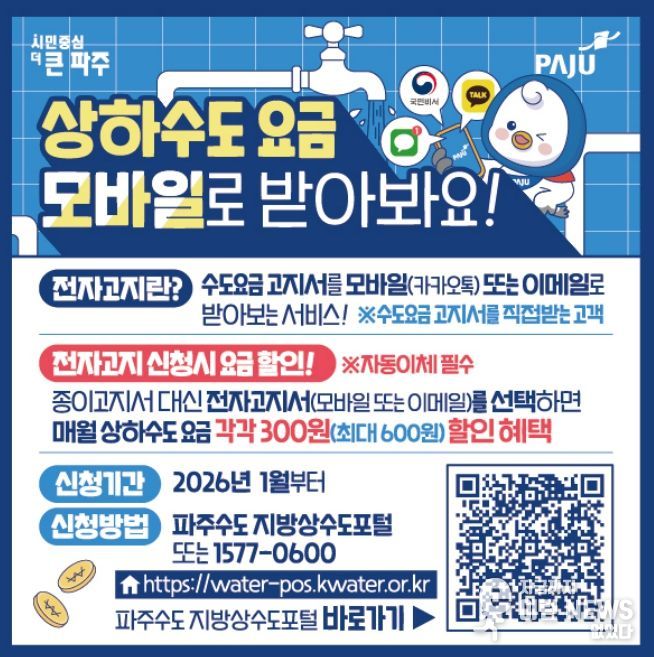 전자고지 신청은 파주수도 지방상수도포털, 국민비서 누리집, 한국수자원공사 고객센터를 통해 가능하다.