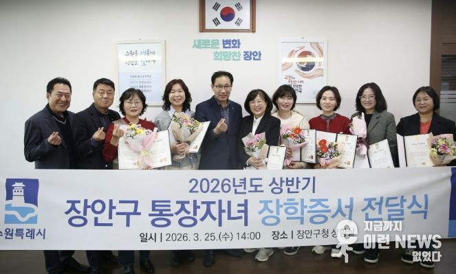 이런뉴스(e-runnews) 김삼성 기자 | 수원시 장안구는 지난 25일, 지역 사회 발전을 위해 행정 최일선에서 헌신하고 있는 통장들의 노고를 격려하기 위해 ‘2026년 상반기 통장자녀 장학증서 전달식’을 개최했다고 밝혔다.