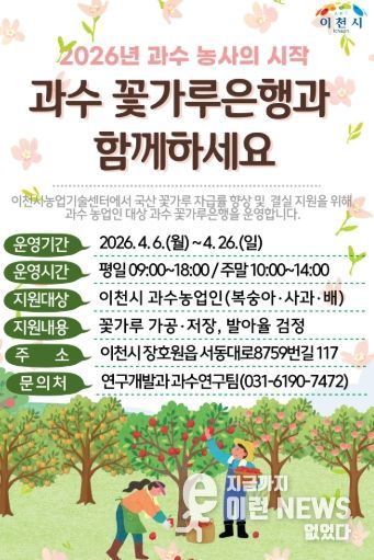 이런뉴스(e-runnews) 김삼성 기자 | 이천시는 개화기 이상기후로 인한 결실 불량과 꽃가루 수급 불안에 대응하기 위해 오는 4월 6일부터 26일까지 3주간 ‘과수 꽃가루은행’을 운영한다.