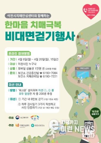 이런뉴스(e-runnews) 김삼성 기자 | 이천시 치매안심센터는 치매에 대한 사회적 관심을 높이고 치매 극복에 대한 의지를 확산하기 위해 ‘한마음 치매극복 비대면 걷기행사’를 4월 6일부터 20일까지 총 15일 동안 개최한다.