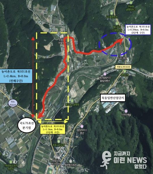 북101호선은 북면 제령리 목동교회 인근에서 소법리 골말교 인근까지 이어지는 총 2.4km 구간이다. 1단계 사업은 2023년 12월 준공과 함께 도로를 개통했으며, 군은 2024년부터 2단계 구간 노선 지정을 위한 행정절차를 진행해 왔다. 이어 올해 1월 보상 협의를 완료하면서 4월 공사 착공을 앞두게 됐다.