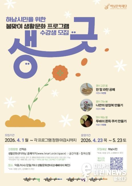오는 4월부터 5월까지 하남시 4개 생활문화센터(덕풍, 미사, 감일, 하다)에서 봄맞이 기획 프로그램 '생~긋!'을 선보인다.