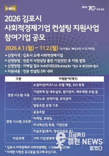 이런뉴스(e-runnews) 김삼성 기자 | 김포시가 관내 사회적경제기업의 지속 가능한 성장과 자생력 강화를 위해 ‘사회적경제기업 역량강화 컨설팅 지원사업’ 참여기업을 오는 11월까지 수시 모집한다.