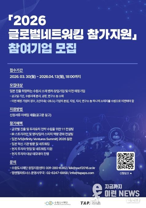 이런뉴스(e-runnews) 김삼성 기자 | 수원특례시가 ‘2026 글로벌네트워킹 참가지원’에 참여할 벤처·창업 기업 7개사를 3월 30일부터 4월 13일까지 모집한다.