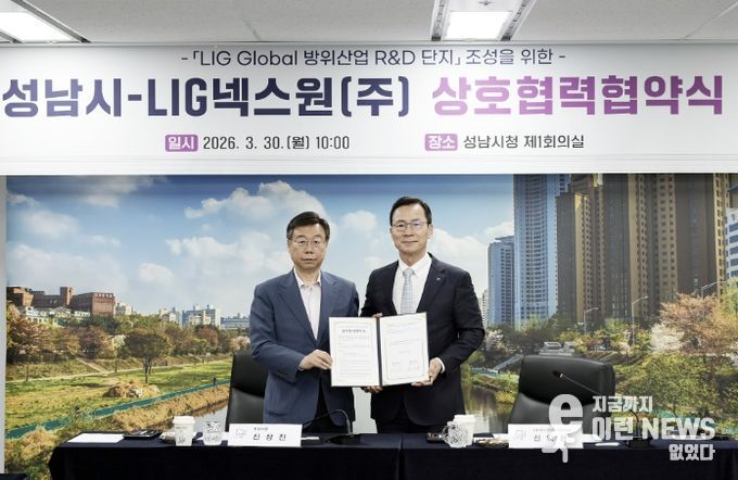 이런뉴스(e-runnews) 김삼성 기자 | 성남시와 LIG넥스원은 30일 방위산업 연구개발(R&D) 단지 조성을 위한 협약을 체결하고, 지역산업 경쟁력 제고와 지역사회 발전을 위해 협력해 나가기로 했다.