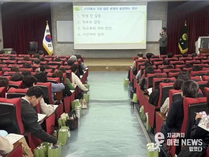연수는 ▲상반기 주요 업무 내용 및 변경 사항 안내를 시작으로 ▲학교폭력 예방 교육 및 사안 처리 절차 이해 ▲학생 분리교육 운영 안내 ▲교육활동 침해 예방 및 대응 방안 ▲화해중재 대화 모임 운영 ▲학생맞춤통합지원 체계 안내 ▲위기학생 지원 방안 등 예방과 사안 처리 전반에 대한 실무 중심 내용으로 구성됐다.