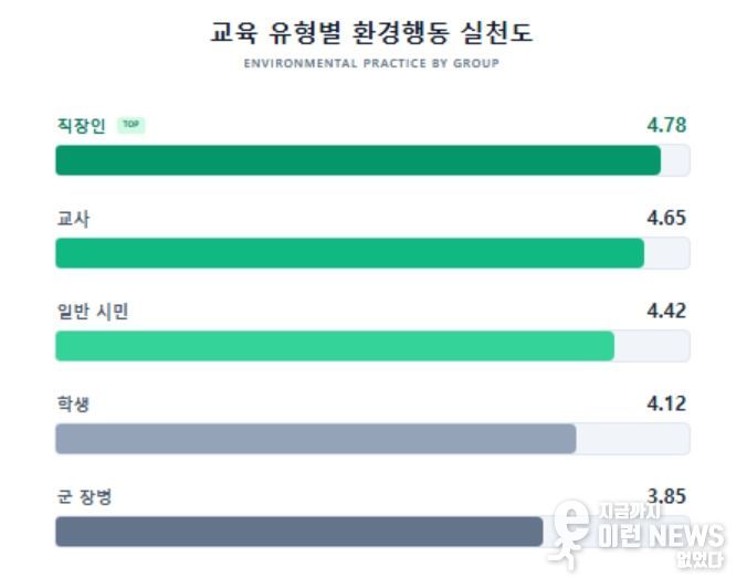 교육 대상별로는 직장인이 4.78점으로 가장 높은 실천도를 보였고, 교사 4.65점, 일반 시민 4.42점 순이었다. 학생은 4.12점, 군 장병은 3.85점에 그쳤다.