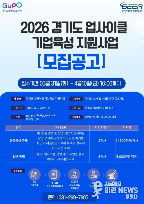 이런뉴스(e-runnews) 김삼성 기자 | 경기환경에너지진흥원이 업사이클 기업을 발굴해 기술 고도화와 사업화를 돕는 ‘경기도 업사이클 기업육성 지원사업’ 참여기업을 10일까지 모집한다.