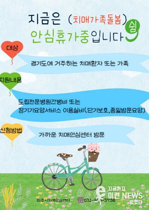이런뉴스(e-runnews) 김삼성 기자 | 파주시가 장기간 치매환자 돌봄에 지친 부양자들에게 휴가와 단기 돌봄 비용을 지원하는 '치매가족돌봄 안심휴가지원' 사업을 본격 추진한다.