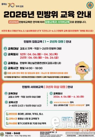 이런뉴스(e-runnews) 김삼성 기자 | 김포시는 2026년 상반기 민방위 대원의 안보 의식 고취와 재난 대응 역량 강화를 위해 ‘2026년 상반기 민방위 교육’을 본격적으로 시행한다고 밝혔다. 이번 교육은 민방위 대원의 연차에 따라 집합교육과 사이버교육으로 구분되어 진행되며, 특히 올해는 연차별 일정을 세분화해 운영한다.