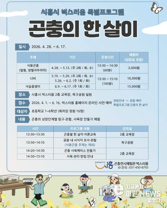 이런뉴스(e-runnews) 김삼성 기자 | 시흥시 곤충체험전시관 ‘벅스리움’은 오는 4월 28일부터 6월 17일까지 초등학생을 대상으로 특별프로그램 ‘곤충의 한 살이’를 운영한다.