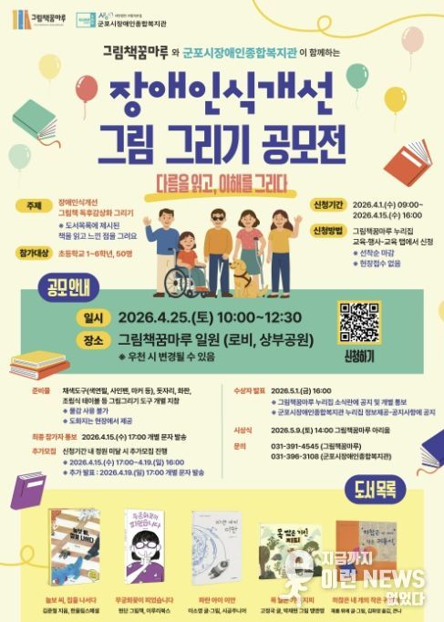 이런뉴스(e-runnews) 김삼성 기자 | 군포 그림책꿈마루와 군포시장애인종합복지관이 공동 주관하는 장애인식 개선 그림그리기 공모전이 오는 4월 25일(토) 10시부터 그림책꿈마루 로비 및 상부공원에서 진행될 예정이다.
