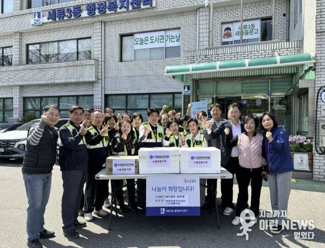 재단은 물품 전달 후 세류3동 관계자들과 함께 인근 수원천 일대에서 쓰레기를 수거하며 쾌적한 마을 환경 조성에 힘을 보탰다.