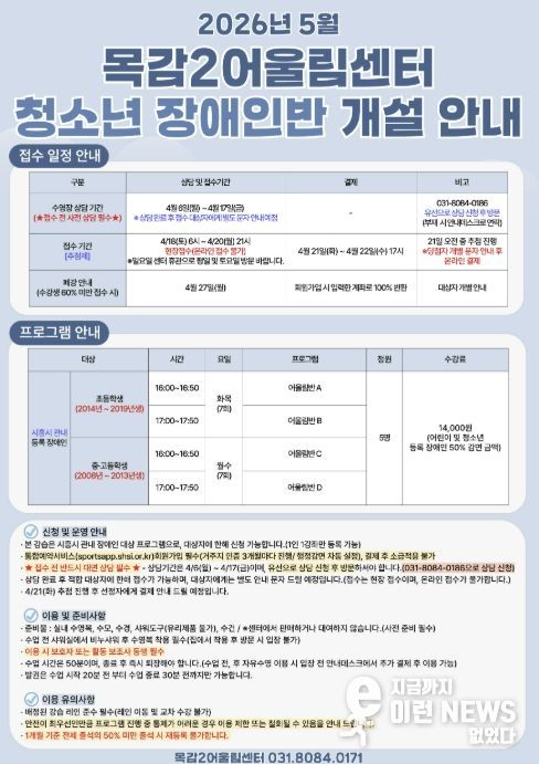 프로그램 접수는 4월 18일 6시부터 4월 20일 21시까지 현장 접수를 진행하고, 4월 21일 당첨자에게 개별 안내할 예정이다. 궁금한 사항은 목감2어울림센터로 문의하면 된다.